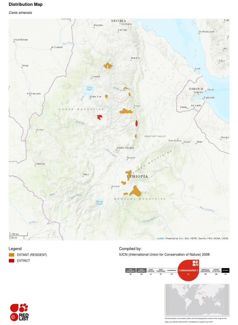 The largest remaining population, around 250 individuals, lives in the Bale Mountains. Beyond that, the species persists in small, fragmented groups scattered across Ethiopia’s highlands. Their range is alarmingly limited (see map), and without continued conservation, the devastating reality is that in a century or less, this fascinating creature may only exist in photos.