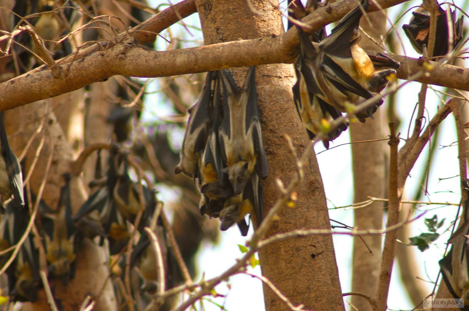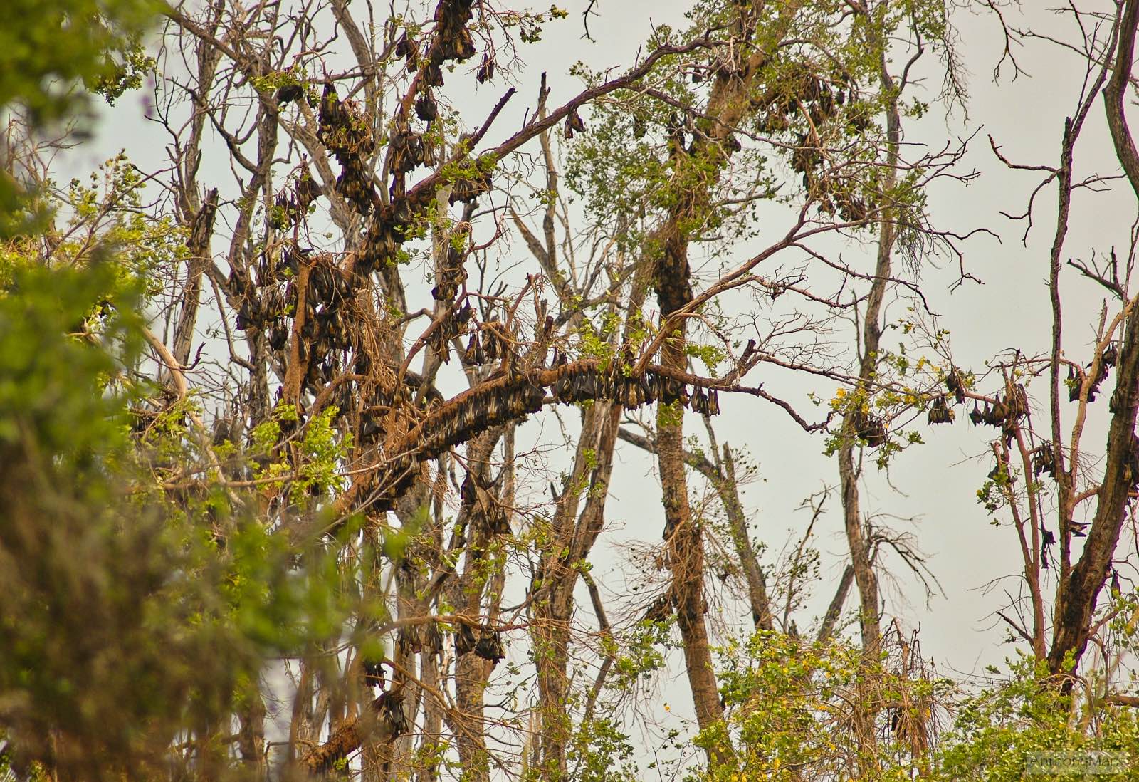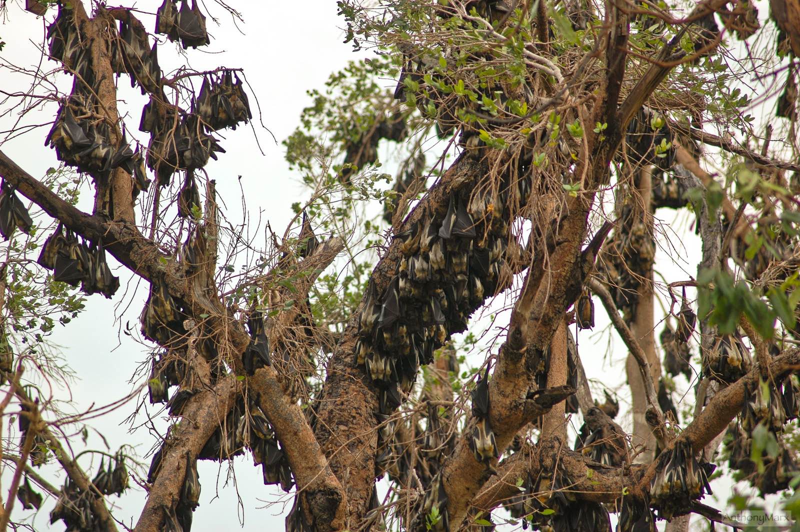 Then, hundreds of bats take off. Our guide, Kenneth, suggests they are perhaps disturbed by the smoke of nearby bushfires. A short while later they settle again, landing against the tree trunks and crawling upwards using their short legs and long thumbnail on their wings. Their yellow backs are highlighted in the sunlight. Huge branches lie on the ground, broken from the weight of the bats.