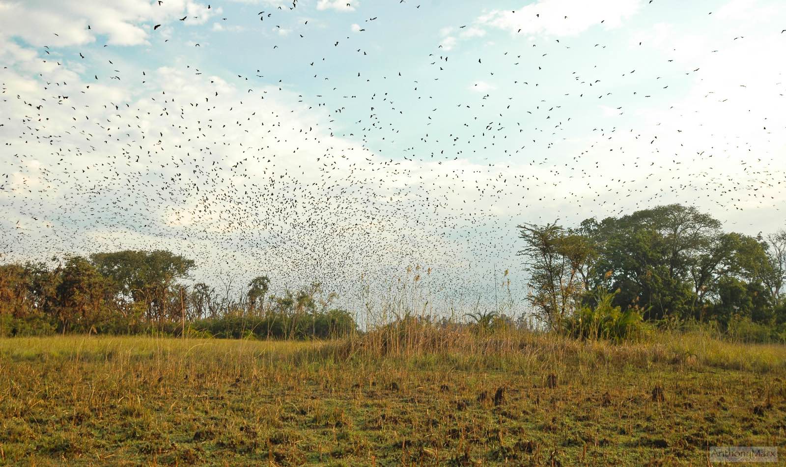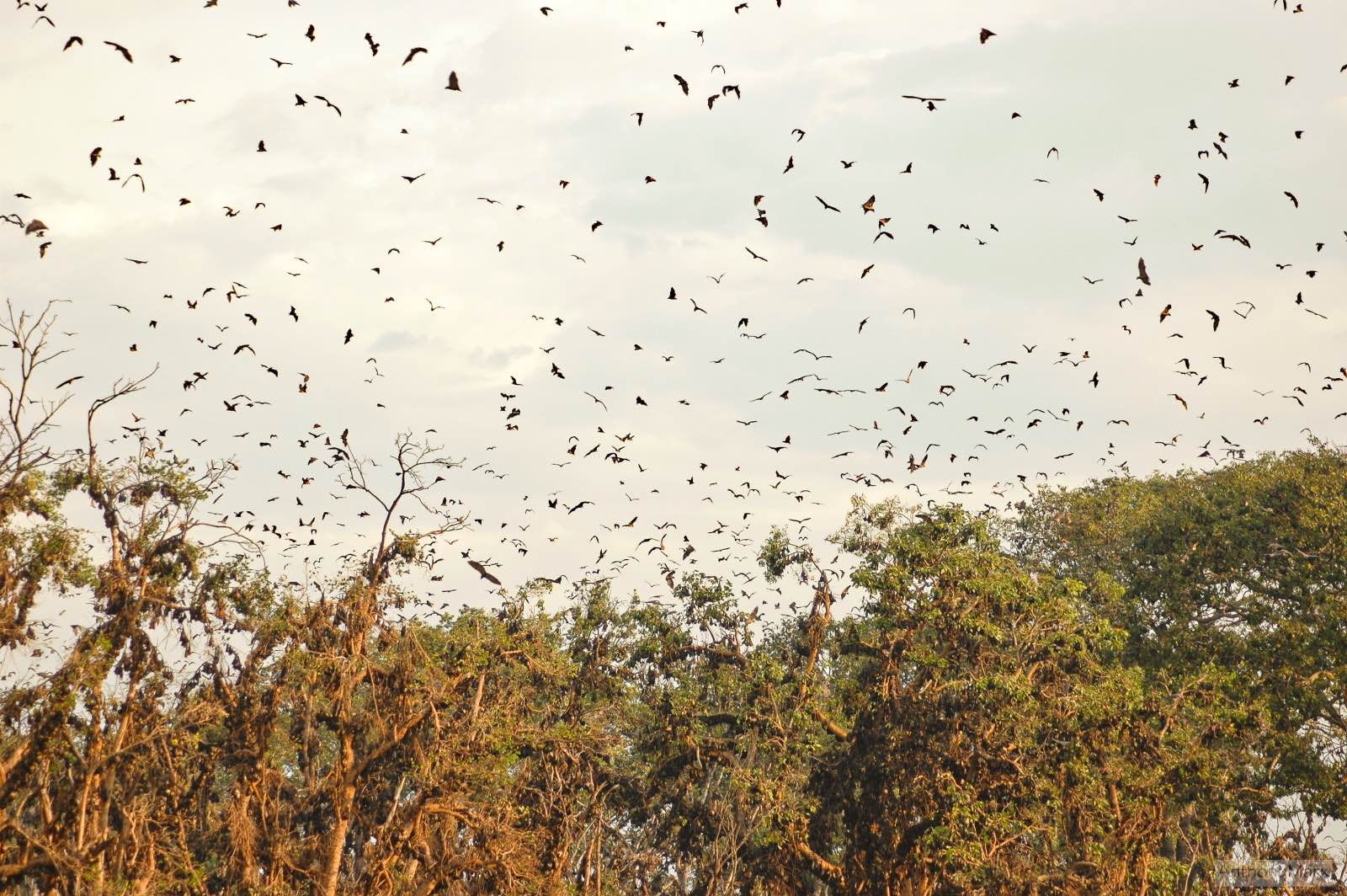 Huge black thunderclouds loom over us, the vegetation contrasts a bright green against the dark purple sky. At 18:11 a few bats take off. Sure enough, within minutes we have a lift-off. Hundreds, then thousands, and finally millions of bats are in the air above us. The noise of the bats, the sound of their wings, and the sight above is spectacular. For 25 minutes bats are taking off from the trees and flying over us, until the sky above is filled with bats, their metre-long wingspan a sight to behold. Within 360 degrees above us, from horizon to horizon are bats. At last the branches of the trees start thinning until there are no bats left. It’s almost dark. We’ve witnessed something that other people will only read about, a unique phenomenon and one of Africa’s great wildlife spectacles.