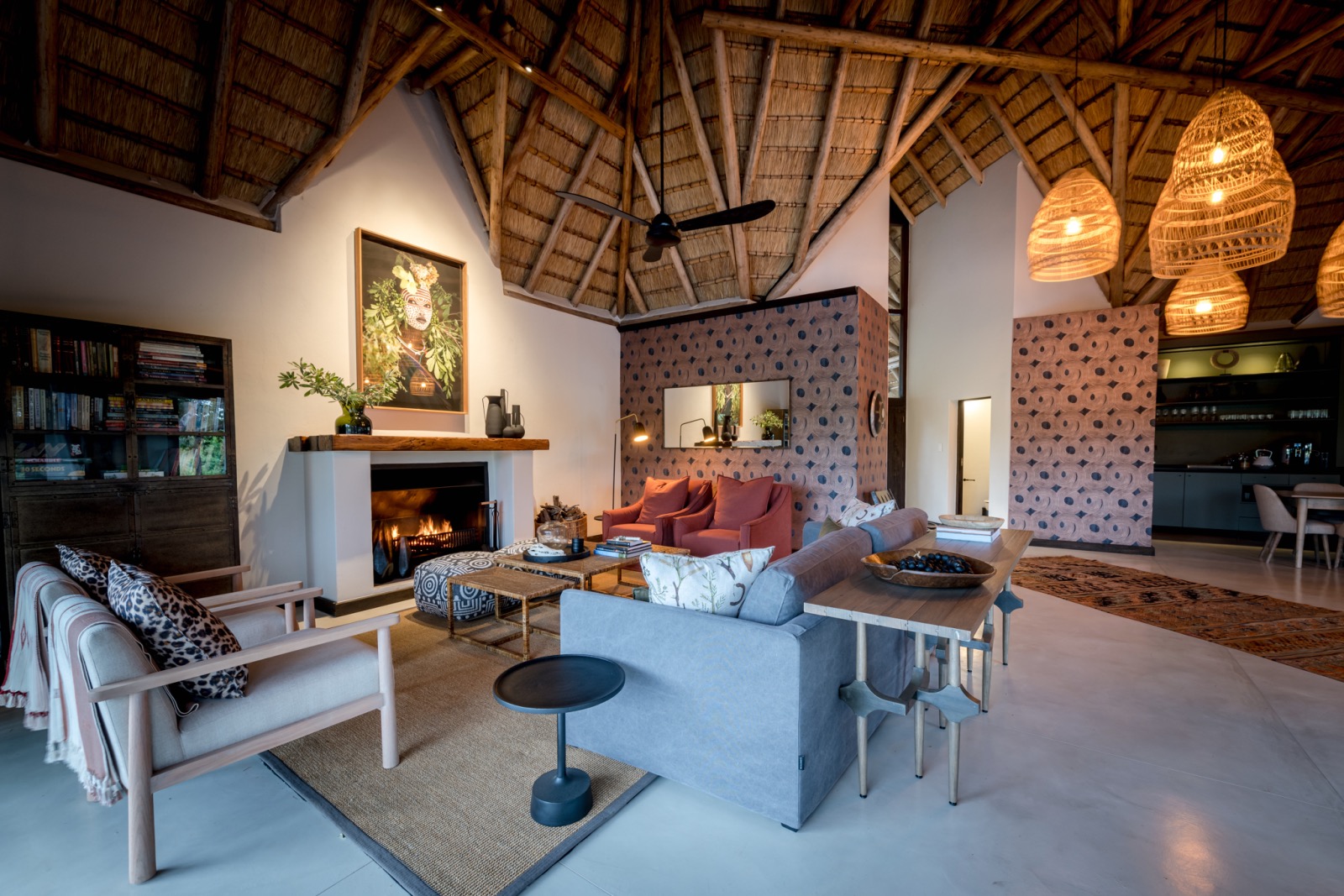 - Main guest area has fully equipped kitchen, indoor and outdoor dining area, coffee bar, easily accessible refreshments fridge, lounge with fireplace, firepit-style boma, extensive deck with pool and sun loungers and seating area.