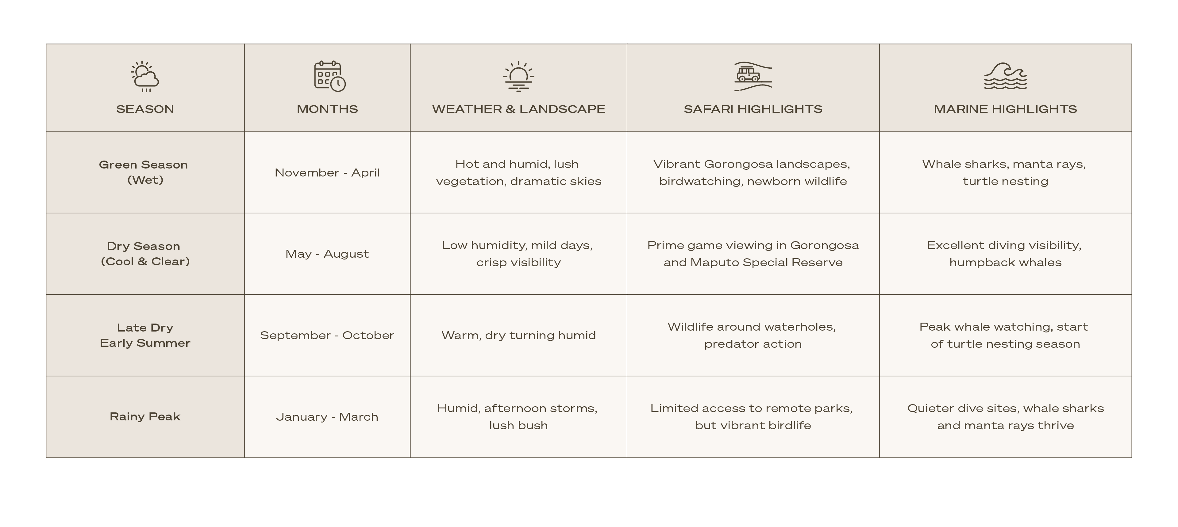 Mozambique enjoys a subtropical climate, meaning it's warm throughout the year. But each season brings its own uniqueness - from the emerald green vibrancy of summer to the dry, clear months that offer world class diving and wildlife sightings.